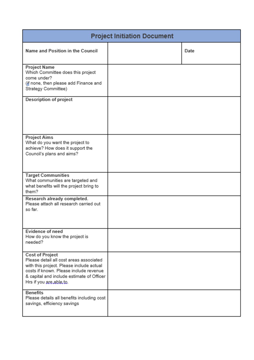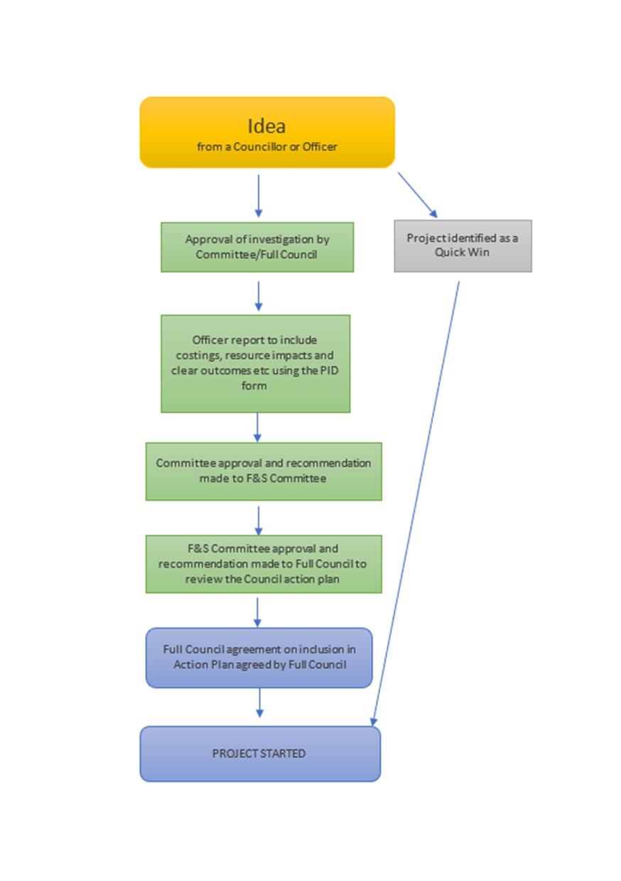 Ideas for projects can be initiated by either Councillors or Officers and should be detailed on the Project Initiation Document (PID) found in Annex 2.